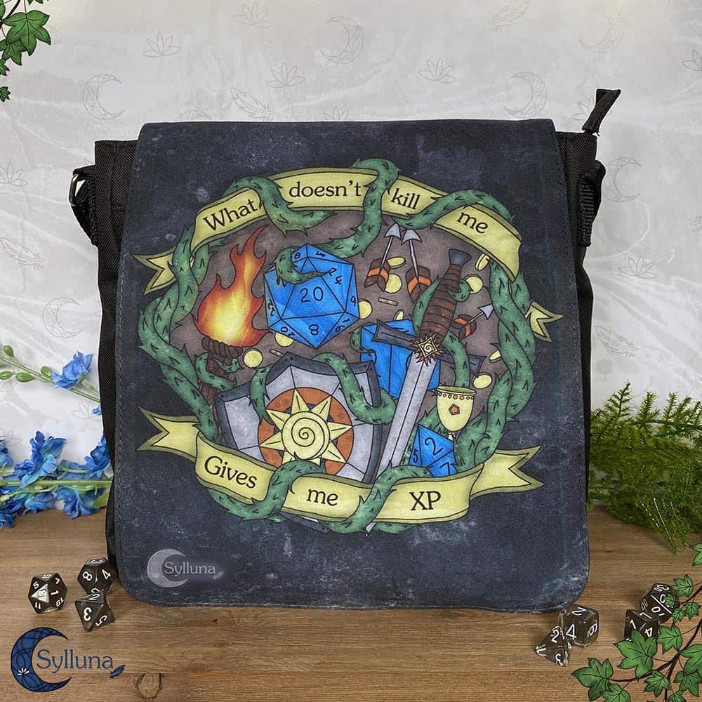What Doesn’t Kill Me Gives Me XP – D&D – Square Large Shoulder Bag € 49,00 A square Sylluna Magic shoulder bag featuring a hand-drawn illustration print. Perfect for everyday use when you want to carry all your essentials. Suitable for keys, wallet, A5 journal/notebook, and more. The bag is not only durable but also thoughtfully organized with multiple compartments. SHIPPING: 3-5 workdays SPECIFICATIONS: Brand: Sylluna®. Base Large Square Shoulder Bag Bag flap featuring a hand-drawn illustration print. Dimensions: 25 × 26 × 6 cm (9.8 × 10.2 × 2.4 inches) Professional print using high-quality printing techniques. The illustrated flap is attached with Velcro and secures with Velcro. The bag features three main compartments with zippers. The bag is made of durable polyester. The shoulder strap is adjustable in length. The bag is water-resistant. The print is waterproof. Ideal bag for everyday use. The bag is made in the Netherlands. Detailed description What Doesn’t Kill Me Gives Me XP – D&D – Square Large Shoulder Bag quantity Add to cart SKU: TASVG-0062-01 Categories: Bag Square Large, Bags Tags: D&D Adventure Quote Illustration Beschrijving Interior This square shoulder bag offers plenty of room for all your everyday essentials — think of your wallet, keys, an A5 notebook, planner and/or tablet, and more. The bag features three main compartments (a spacious main compartment, a smaller middle compartment, and a front compartment), all secured with zippers. Inside the large compartment you’ll also find an additional zip pocket and a small open pocket for quick-access items. It’s an ideal bag for everyday use, keeping your belongings well organized and safely stored. Material & Quality The bag is made of high-quality materials (a durable fabric/polyester blend), and the illustration is printed with sharp detail. The design is infused deep into the fabric, so there’s no risk of it peeling or flaking off over time. Interchangeable Bag Flaps The illustrated flaps can be attached and removed easily with strong Velcro, allowing you to switch between different designs in no time. This product includes both the base bag and the displayed flap, making it a complete set. Additional flaps in the correct size can be purchased separately, so you can change your bag’s design whenever you like. Shoulder Strap The length of the shoulder strap is adjustable, allowing you to set the bag at a height that suits your body and feels comfortable to carry. Actual colors may vary slightly due to different screen settings. Sylluna®